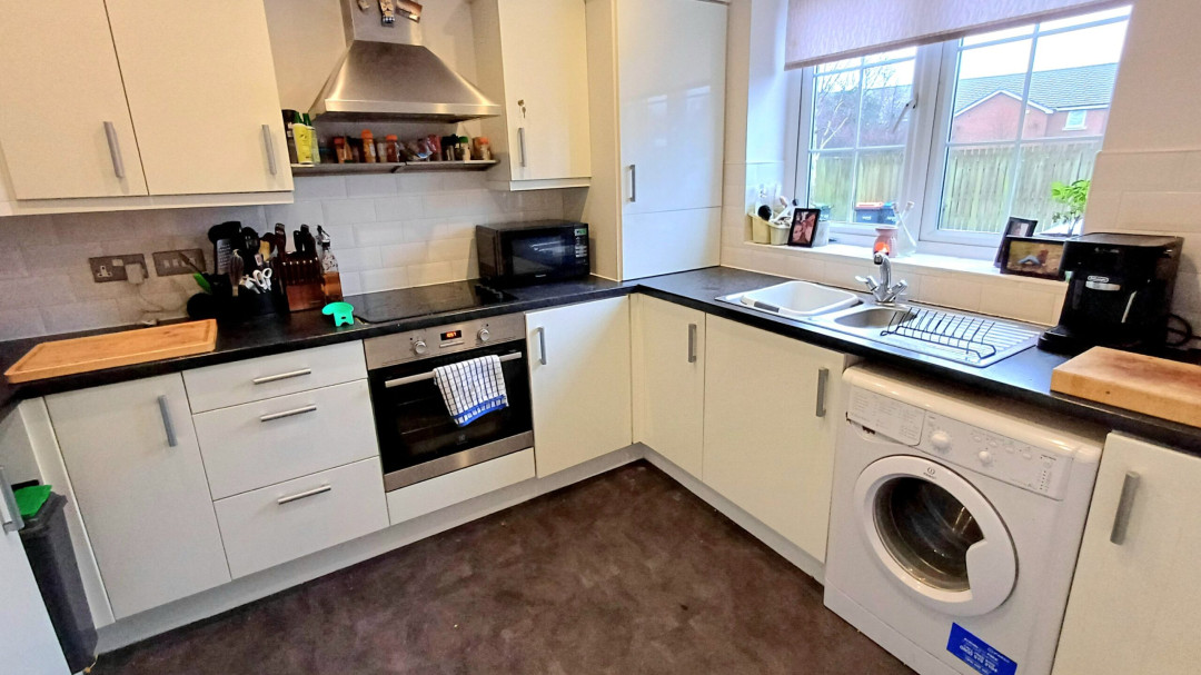 Fitted with a range of base and eye level units comprising of a stainless steel sink and drainer, four ring electric hob with extractor over, oven, space for washing machine, built in fridge freezer, radiator, spot lighting, window to front.