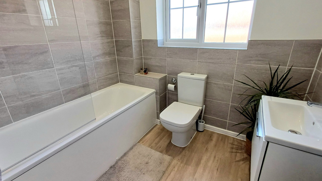 Low level WC, wash basin, panelled bath with shower over, towel radiator,spot lighting, part tiled walls, window to front.