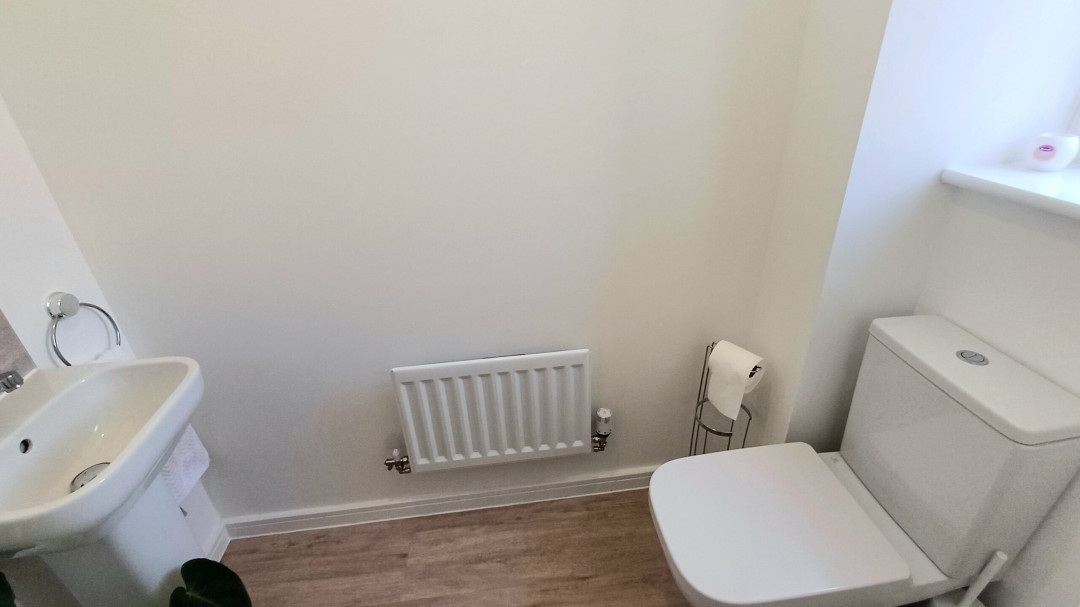 Radiator, laminate flooring, storage cupboard, stairs to first floor.