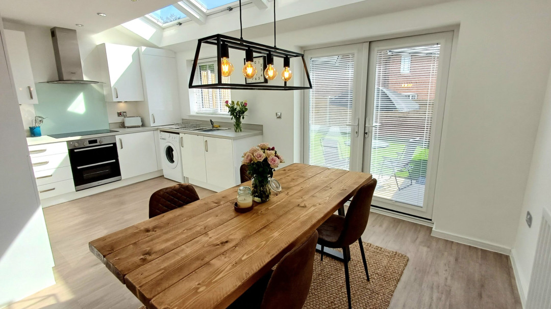 Range of base and eye level units incorporating a sink and drainer, electric hob with extractor over, double oven, built in fridge freezer, space for washing machine, spot lighting, window to rear, French doors to garden.