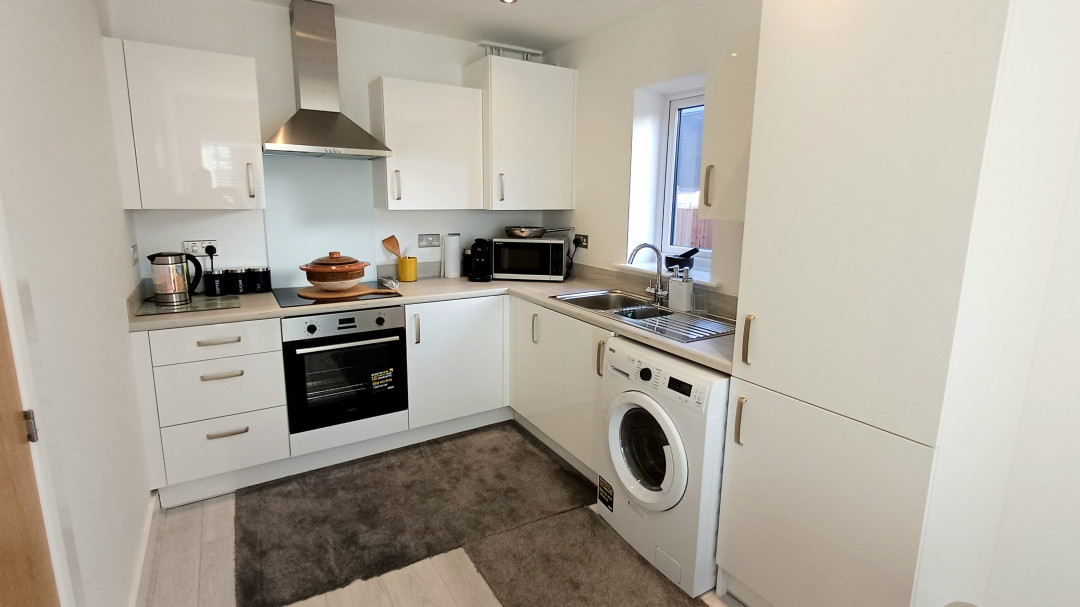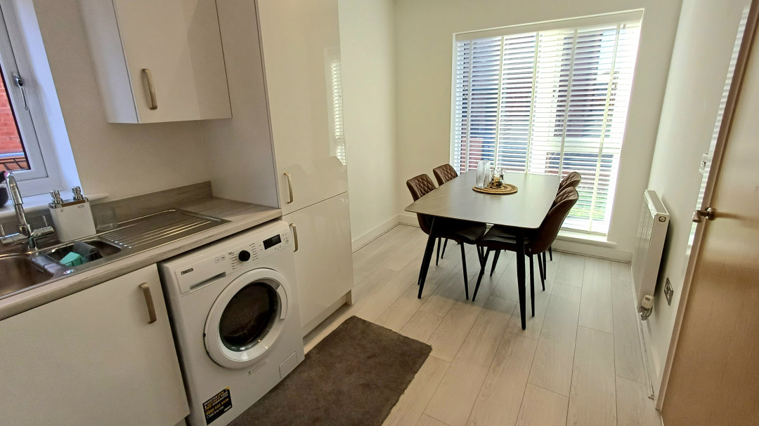 Base and eye level units incorporation sink and drainer, electric hob with extractor over, oven, built in fridge freezer, space for washing machine, radiator, dining area, wood effect floor, window to front and side.