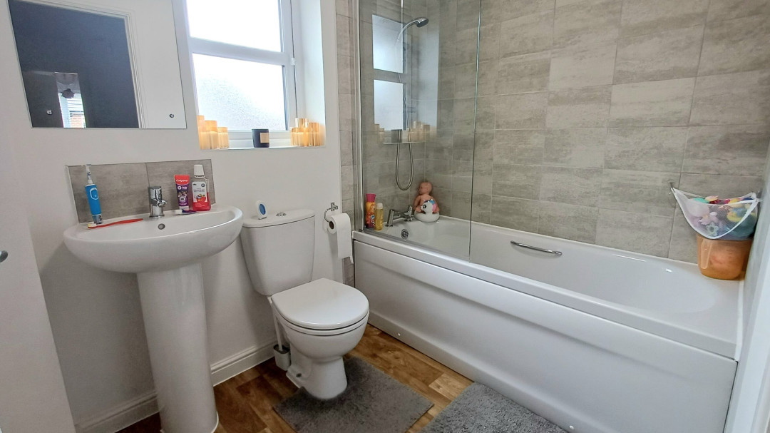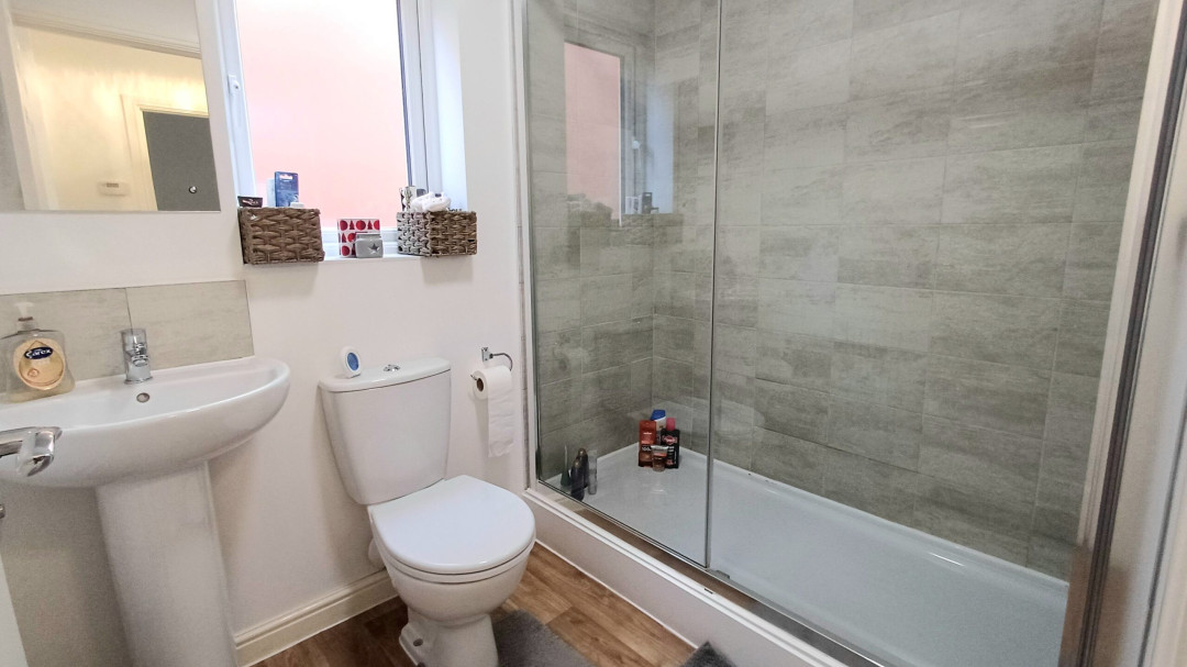 Low level W.C, pedestal wash hand basin, panelled bath with shower over, partly tiled walls, radiator, window to front.