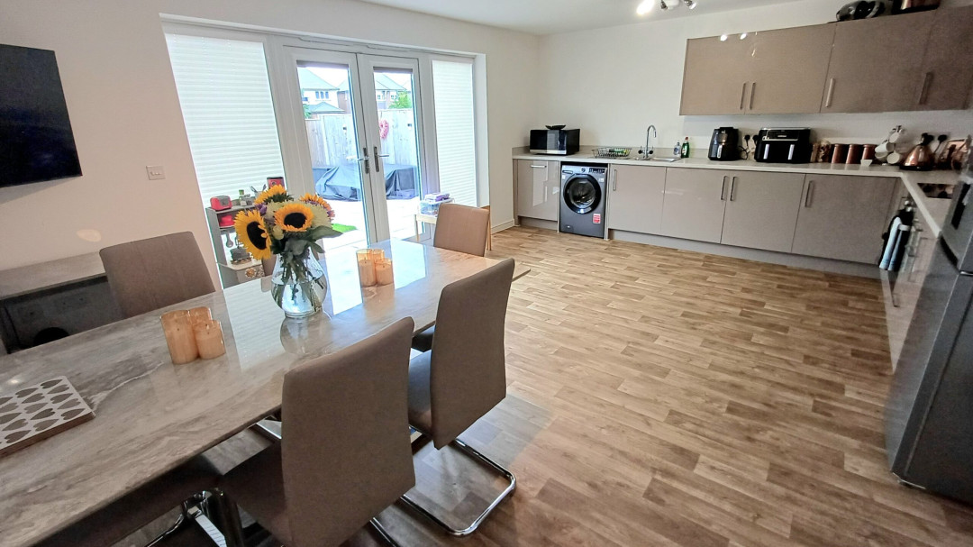 Wall and base units with rolled over edge work surfaces, stainless steel sink and drainer, electric hob with extractor over, oven, space for a washing machine and fridge freezer, dining area, radiator, storage cupboard, French doors to garden.