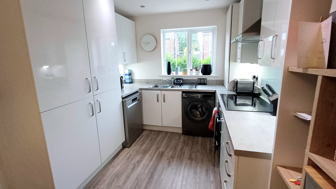 Range of base and eye level units incorporating a sink and drainer, electric induction hob with extractor over, oven, space for washing machine and dishwasher, built in fridge freezer, spot lighting, radiator, dining area, spot lighting, window to front.