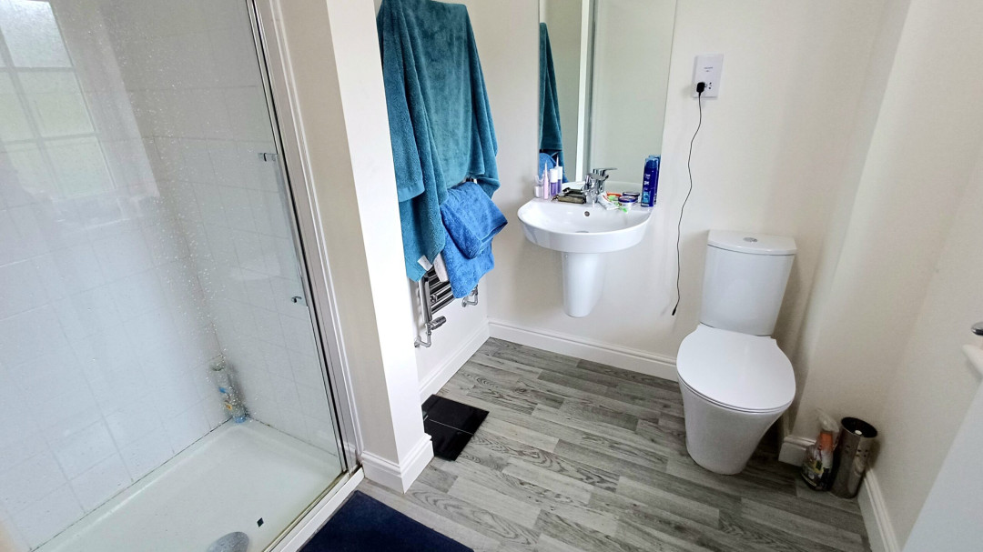 Low level WC, wash basin, shower cubicle, radiator, window to front.