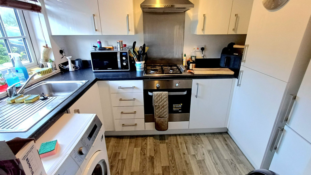 Range of base and eye level units incorporating a sink and drainer, gas hob with extractor over, oven, space for fridge freezer and washing machine, window to front.