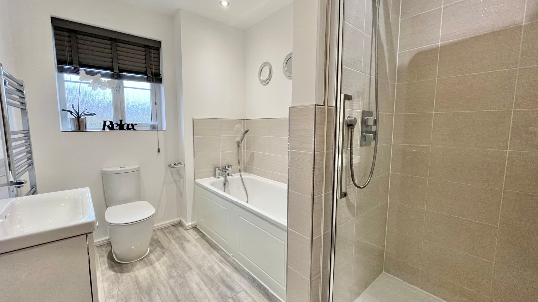 Low level WC, wash basin, panelled bath, separate shower cubicle. .