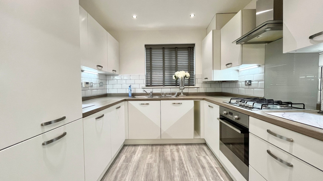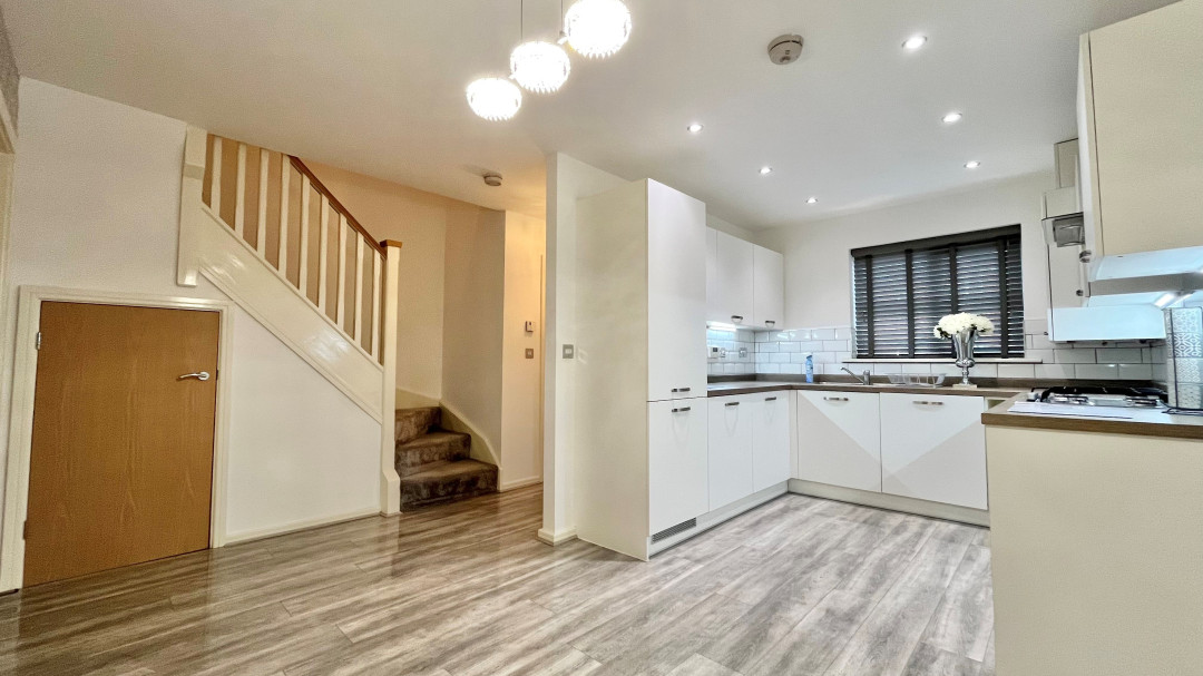 Range of base and eye level units incorporating a sink and drainer, gas hob with extractor over, oven, built in fridge freezer, spot lighting, dining area.