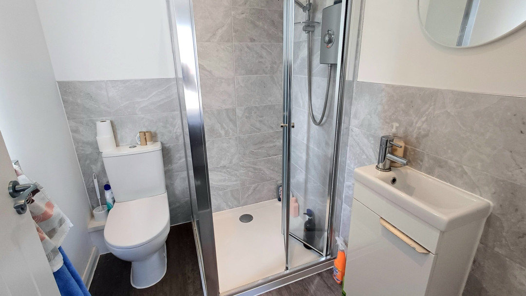 Low level WC, wash basin, shower cubicle, towel radiator, part tiled walls, window to side.