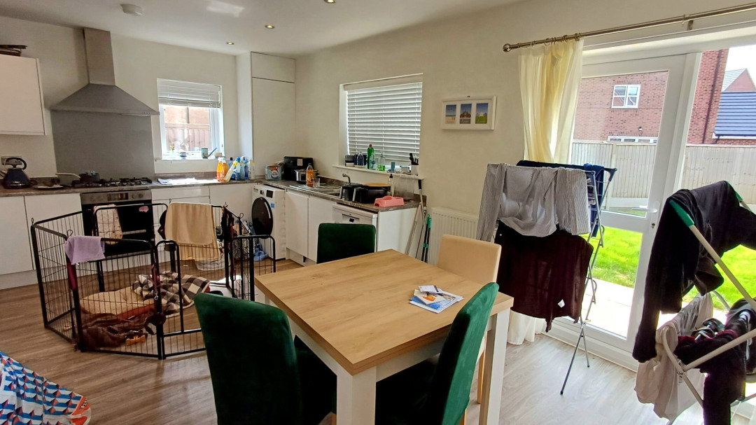 Fitted with a range of base and eye level units incorporating a sink and drainer, gas hob with extractor over, double oven, built-in fridge freezer, space for washing machine and dishwasher, radiator, spot lighting, window to side and rear, French doors to garden.
