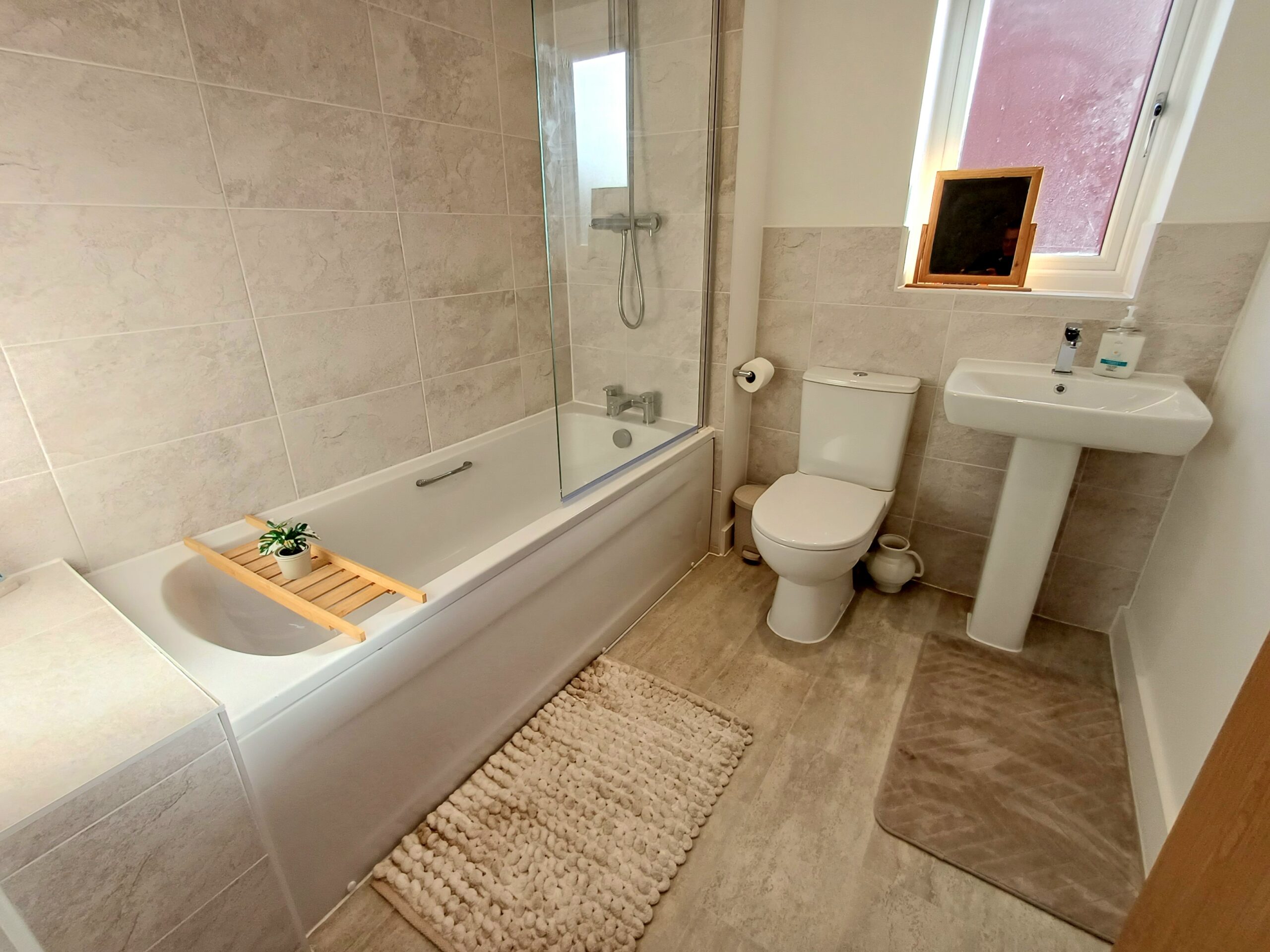 Low level WC, wash basin, panelled bath with shower over, towel radiator, part tiled walls, spot lighting, window to side.