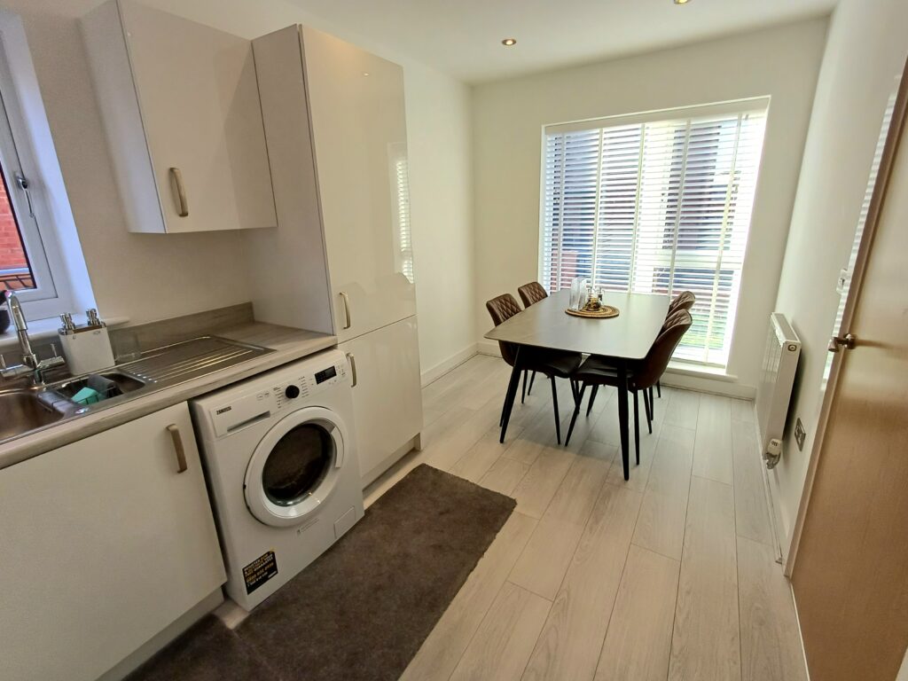 Base and eye level units incorporation sink and drainer, electric hob with extractor over, oven, built in fridge freezer, space for washing machine, radiator, dining area, wood effect floor, window to front and side.