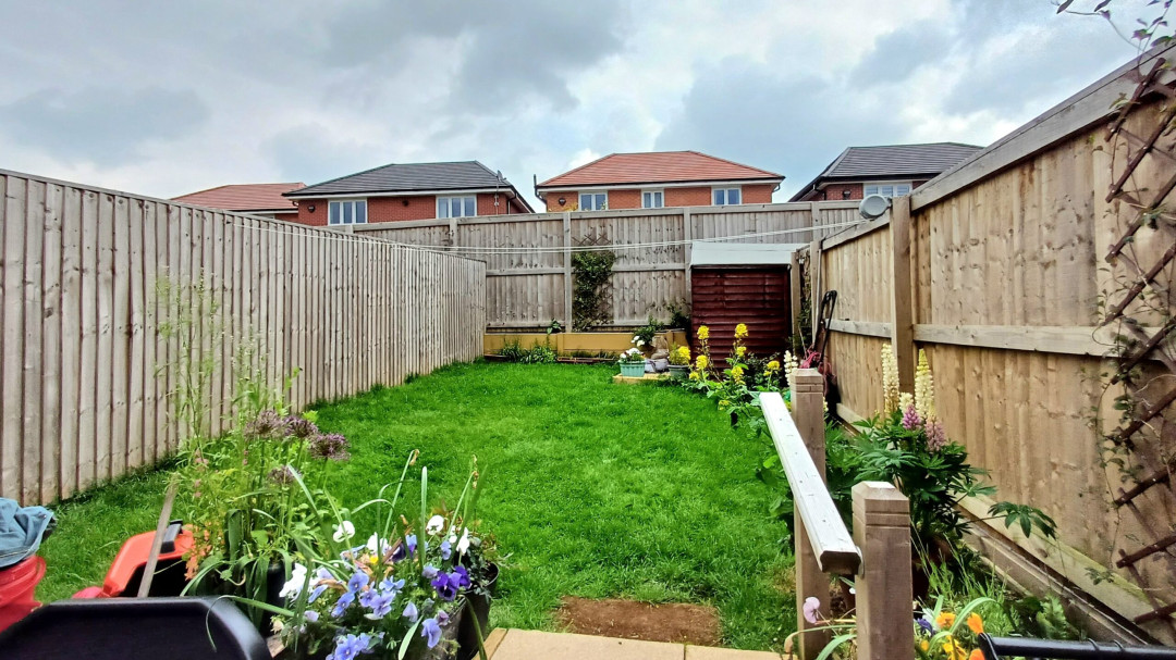 To the front of the property there is a lawned garden. To the side there is parking for two cars and access to the rear garden, which is laid to lawn.