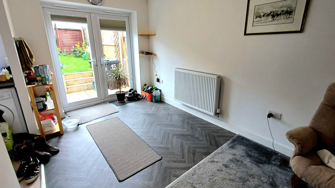 Radiator, French doors to garden. Opening to kitchen.