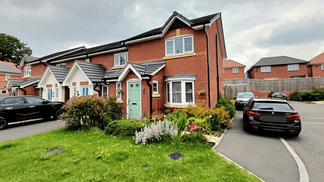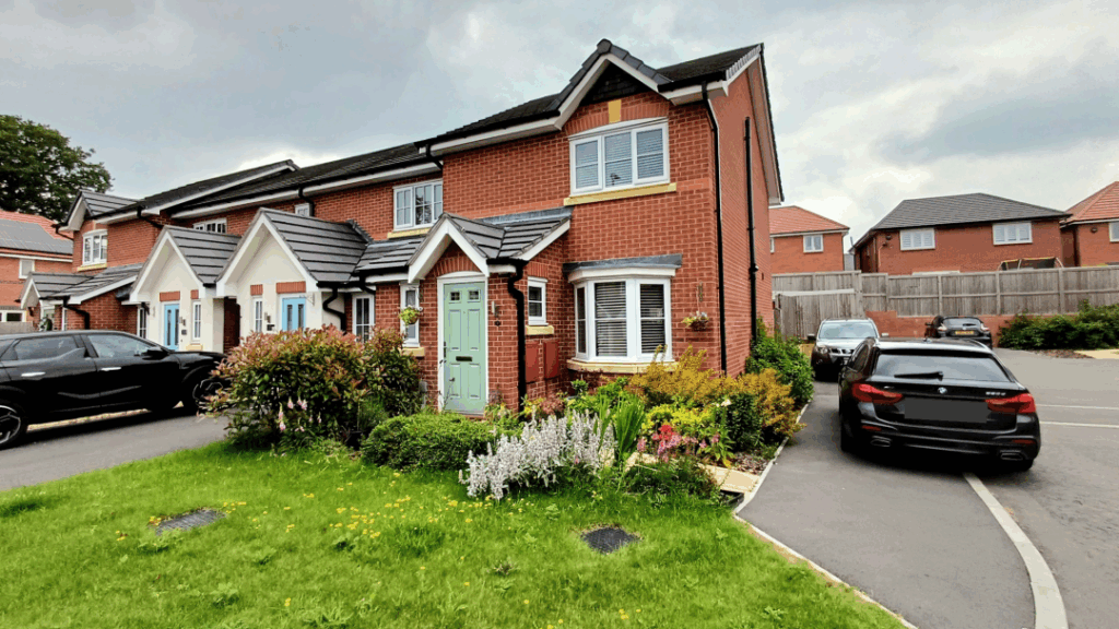 To the front of the property there is a lawned garden. To the side there is parking for two cars and access to the rear garden, which is laid to lawn.