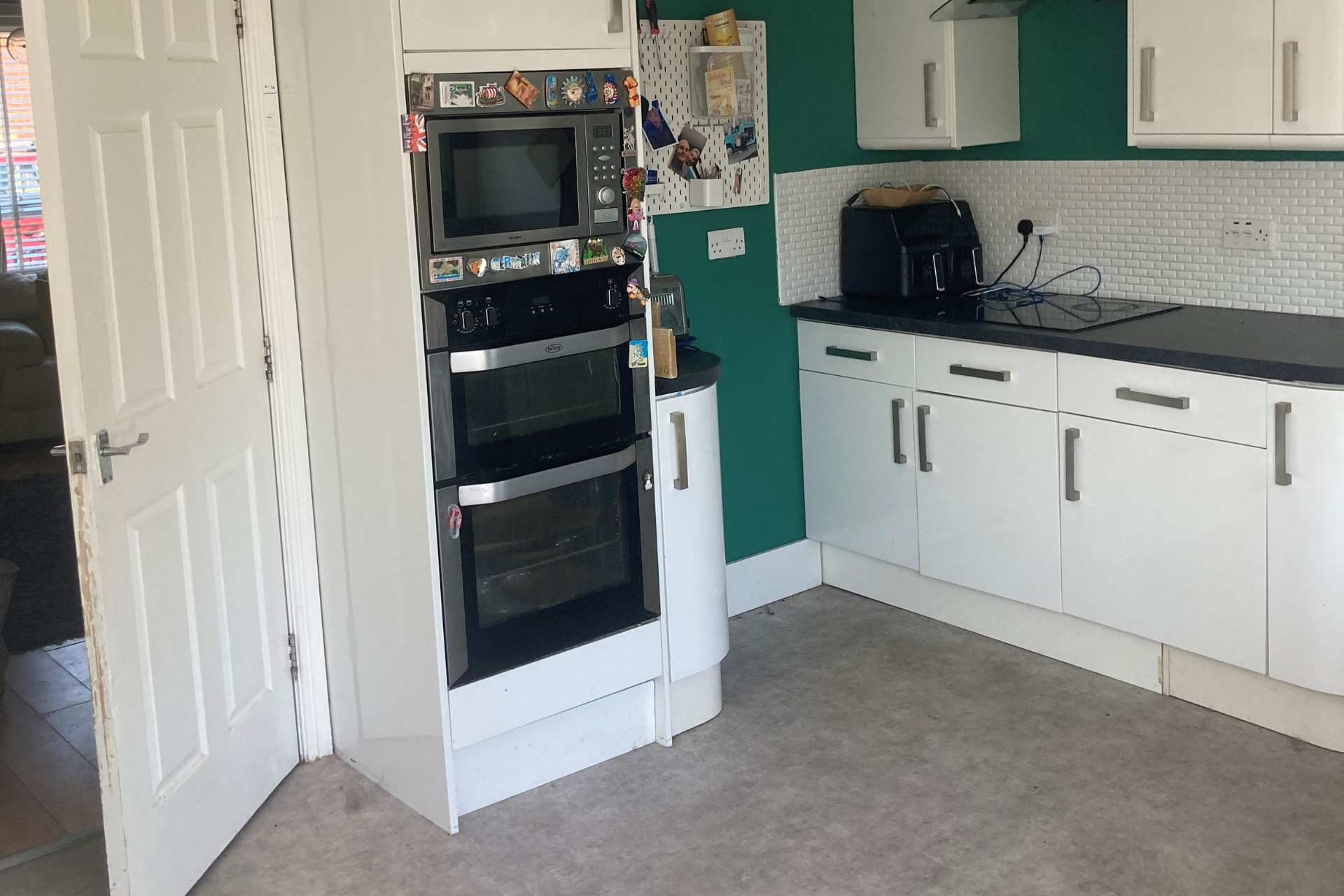 Fitted wall and base units, complementary work surfaces, chimney extractor hood, stainless steel sink and drainer unit with mixer tap, plumbed for automatic washing machine, tiled splash backs, laminate flooring and double glazed door to rear leading to garden.