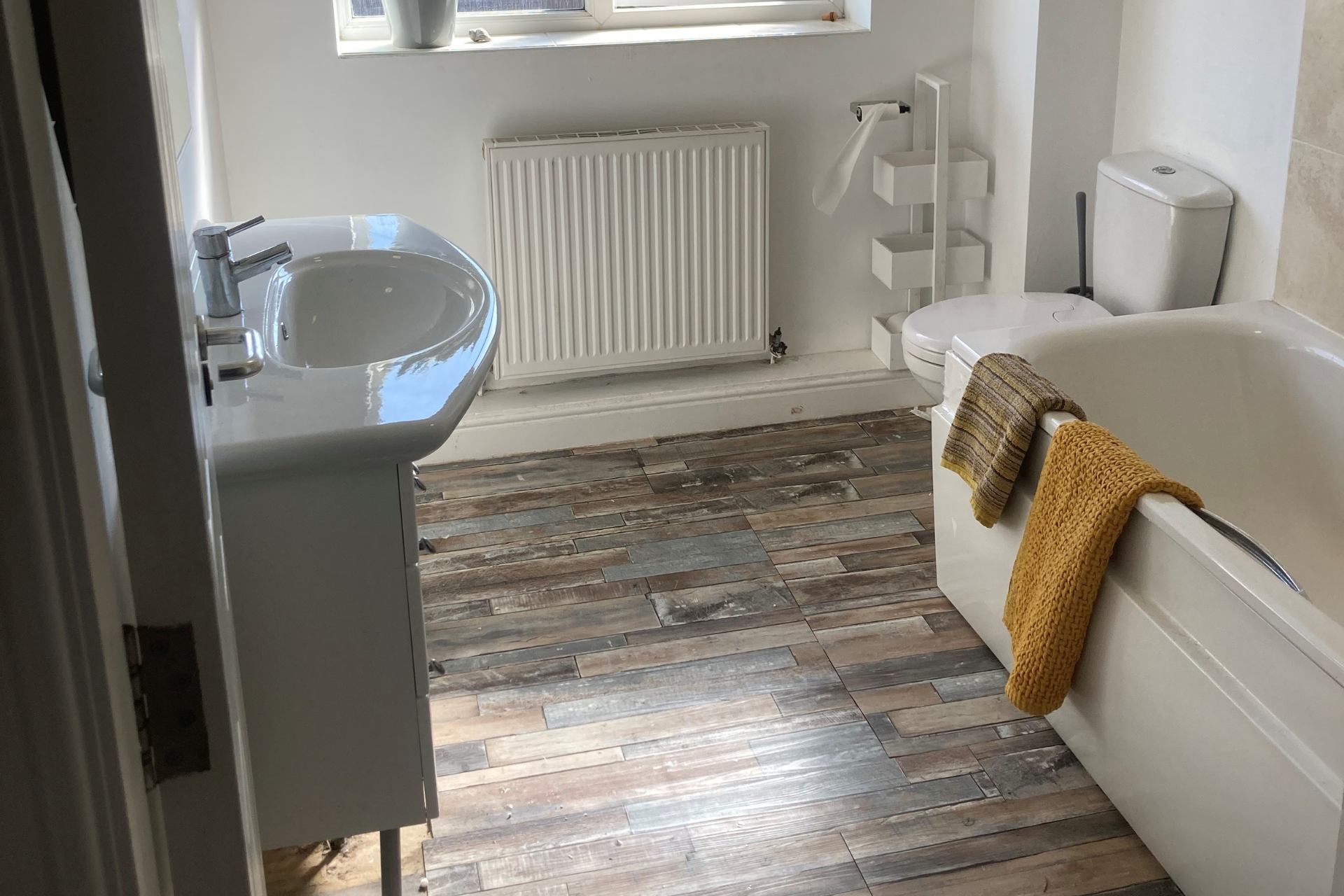 Low flush WC, pedestal wash hand basin, extractor fan, laminate flooring and central heating radiator.