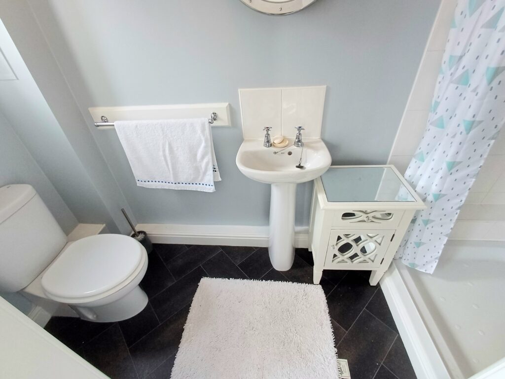 Low level WC, pedestal wash hand basin, shower cubicle, radiator, window to front.