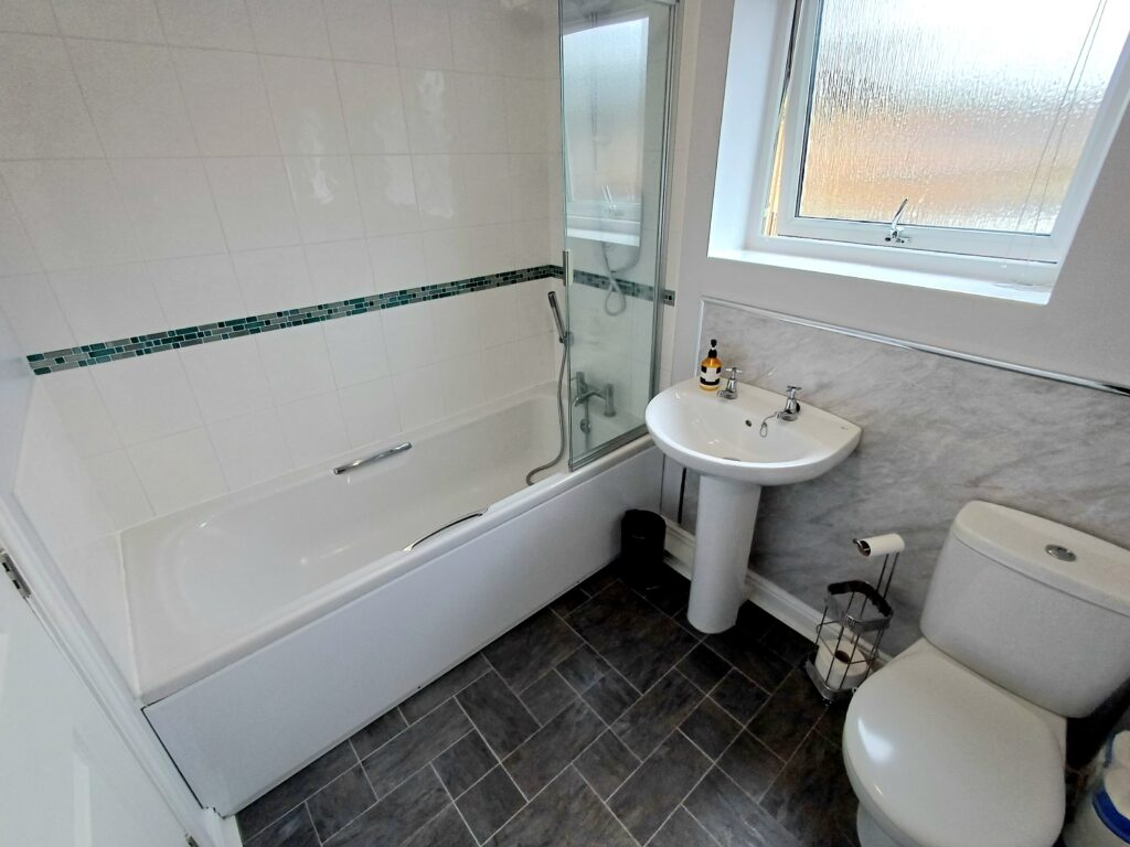 Fitted with white suite comprising low level WC, pedestal wash hand basin and bath with shower over, part tiled walls, radiator, window to side.