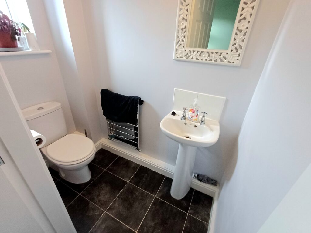 Low level WC, pedestal wash hand basin, radiator, window to front.