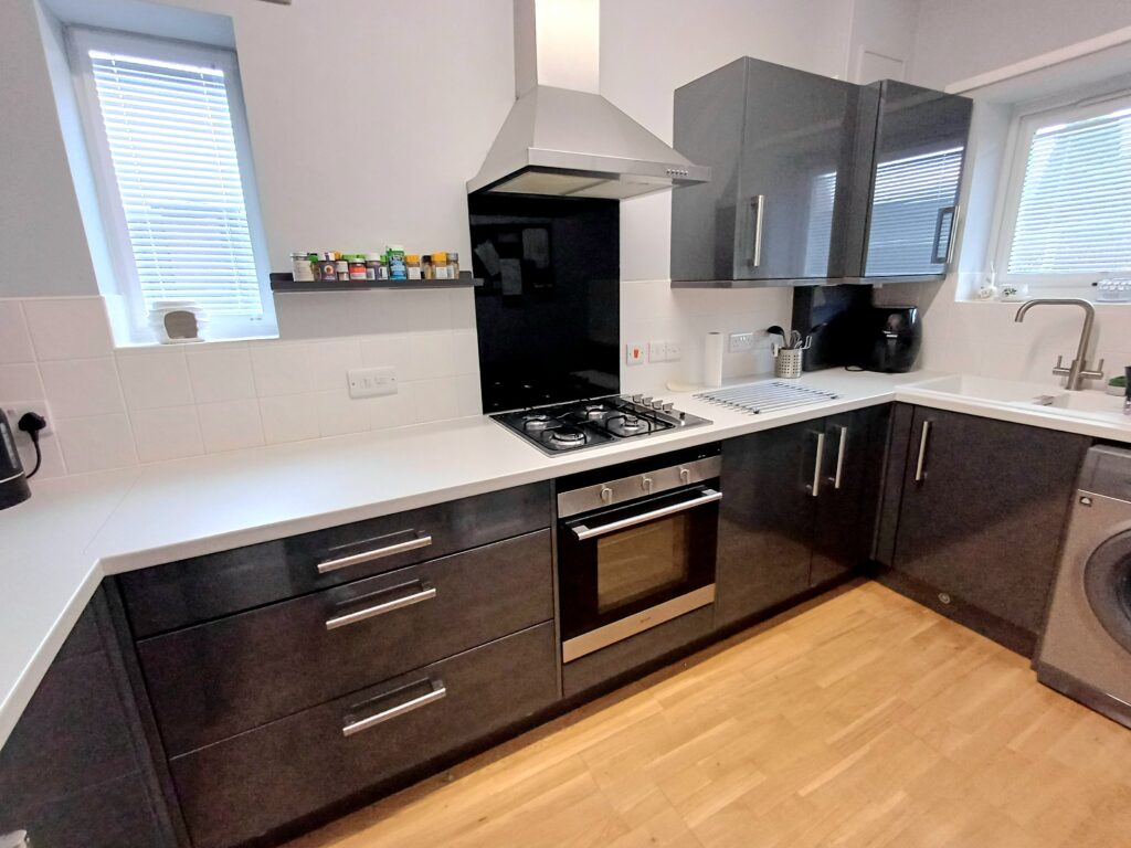 Fitted with a range of wall cupboards and base units with work surface over, one and a half bowl sink unit and drainer, built in oven, four ring gas hob with extractor fan over, space for fridge/freezer and washing machine, radiator, laminate flooring, window to front and side.