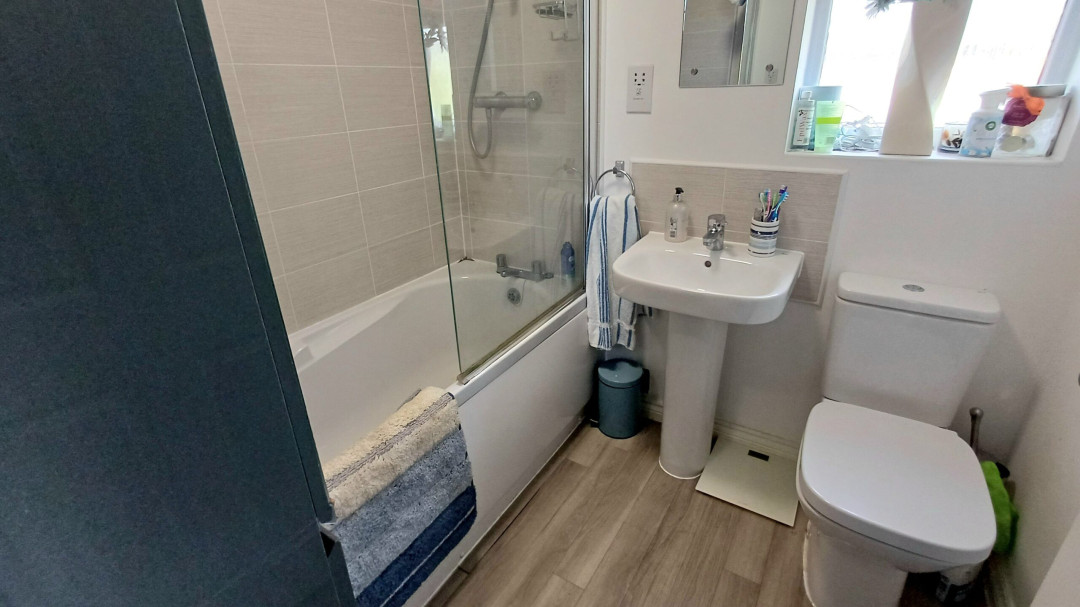 Suite comprising of a low level WC, wash basin, panelled bath with shower over, tiled walls, radiator, window to front.