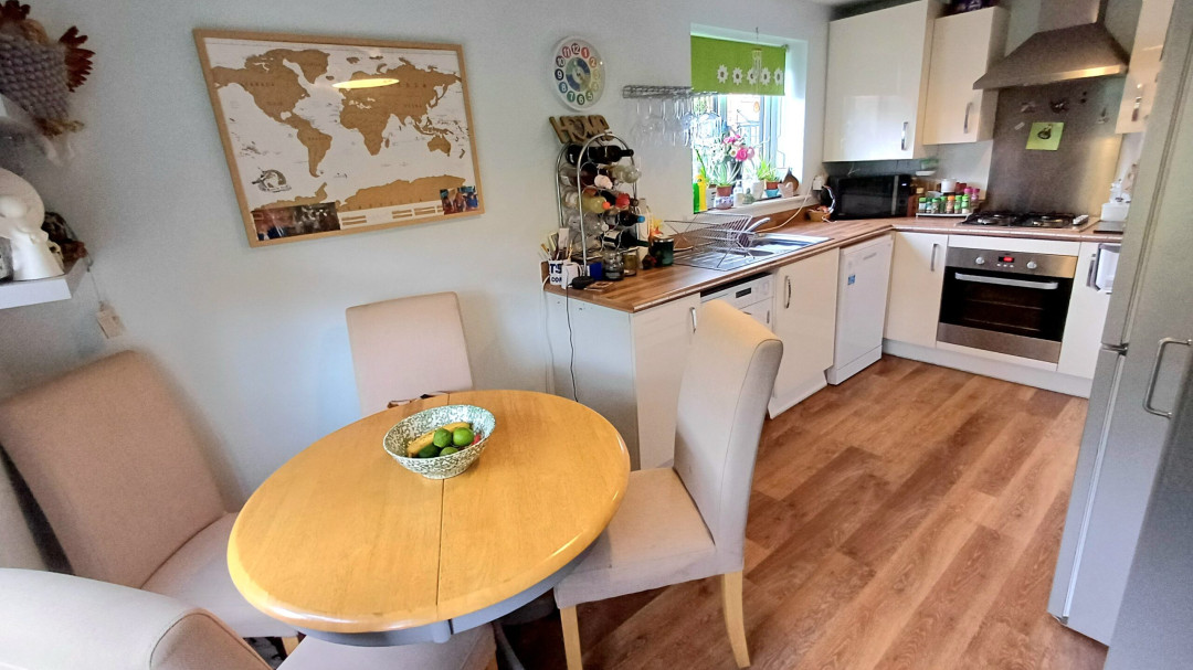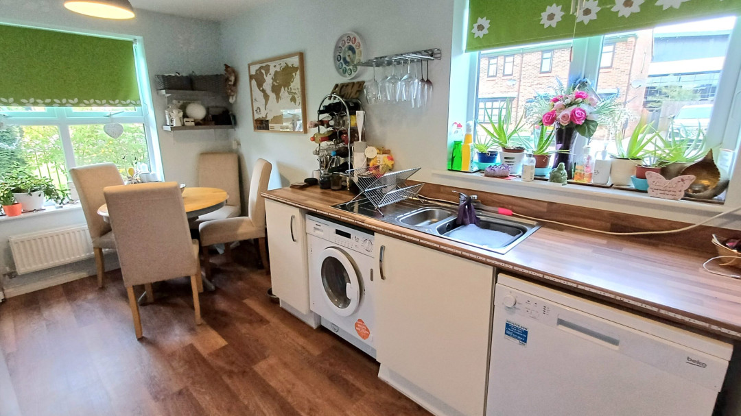 Fitted with a modern range of base and eye level units comprising of a sink and drainer, gas hob with extractor over, oven, space for fridge freeze, washing machine and dishwasher, radiator, windows to front and side.