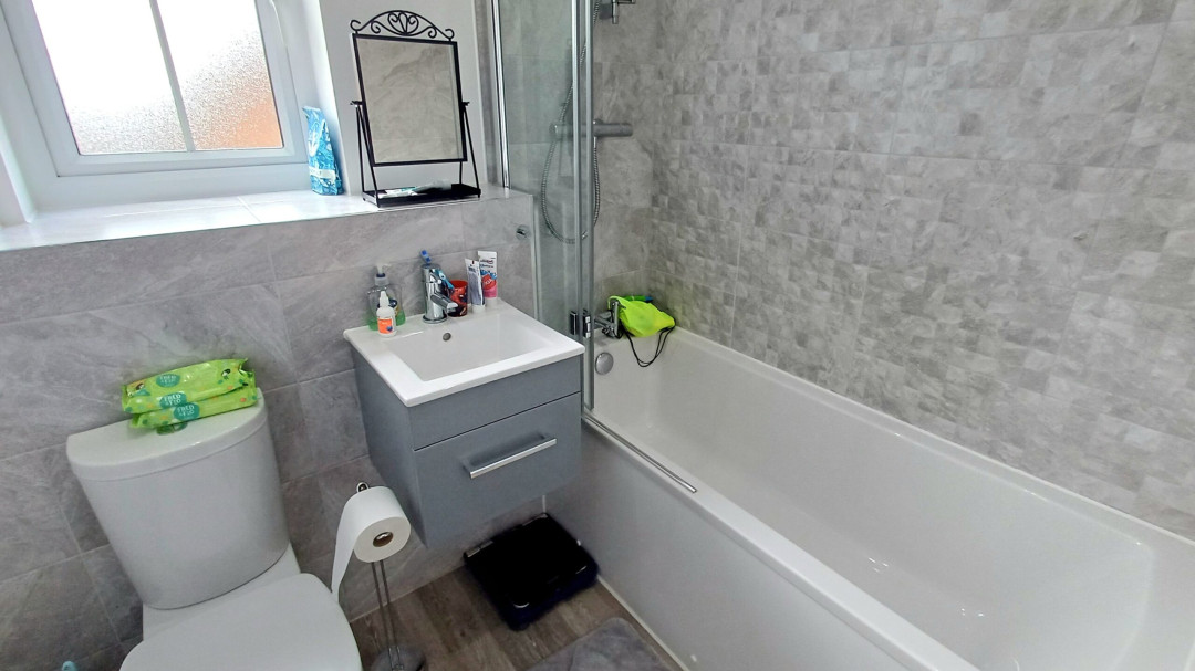 Low level WC, wash basin, panelled bath with shower, part tiled walls, towel radiator, spot lighting, window to side.