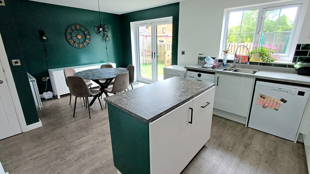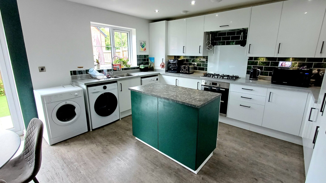 Range of base and eye level units incorporating a sink and drainer, gas hob with extractor over, double oven, built in fridge freezer, space for washing machine and dishwasher, central island, radiator, spot lighting, window to rear, French doors to garden.
