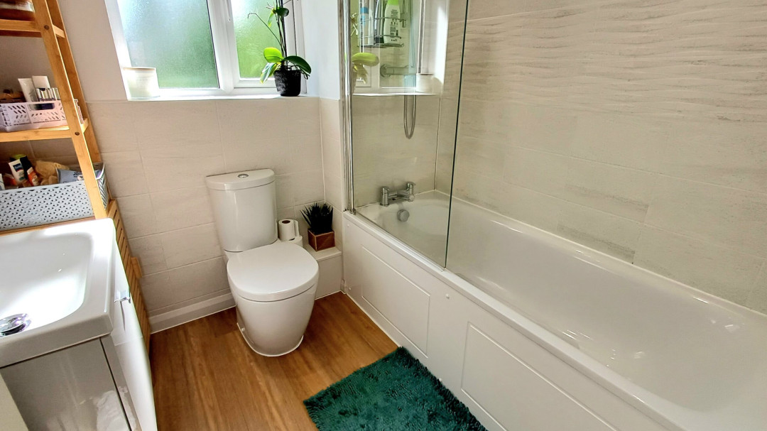 Low level WC, wash basin, panelled bath with shower over, towel radiator, spot lighting, part tiled walls, window to front.