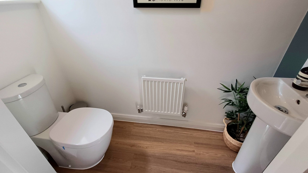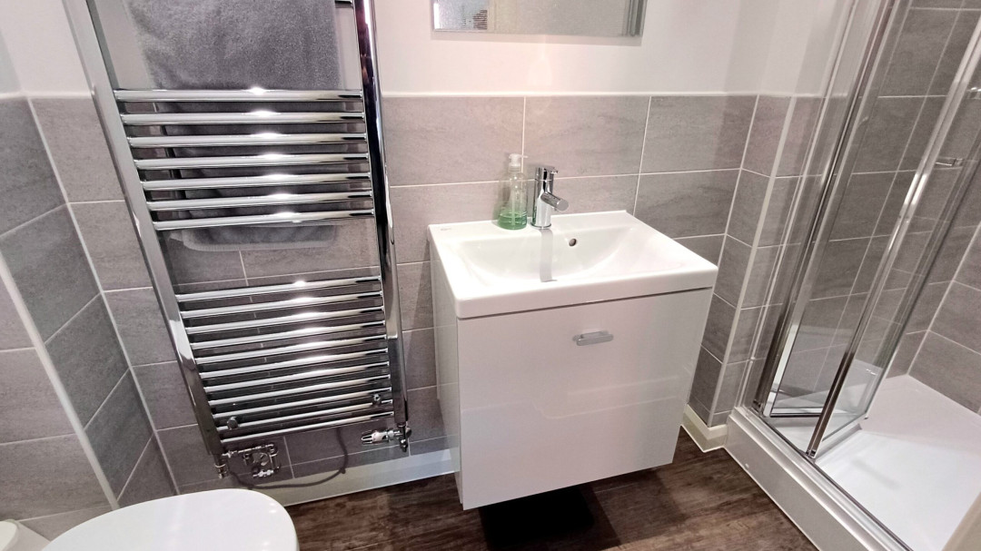 Low level WC, wash basin, shower cubicle, towel radiator, spot lighting, part tiled walls.