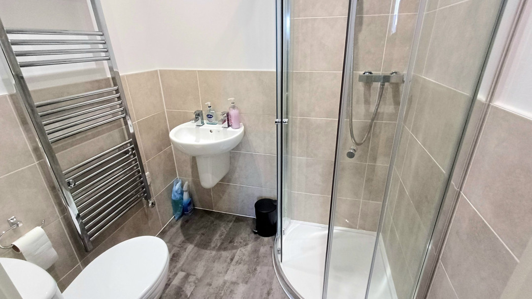 Low level WC, wash basin, shower cubicle, towel radiator, spot lighting, part tiled walls.