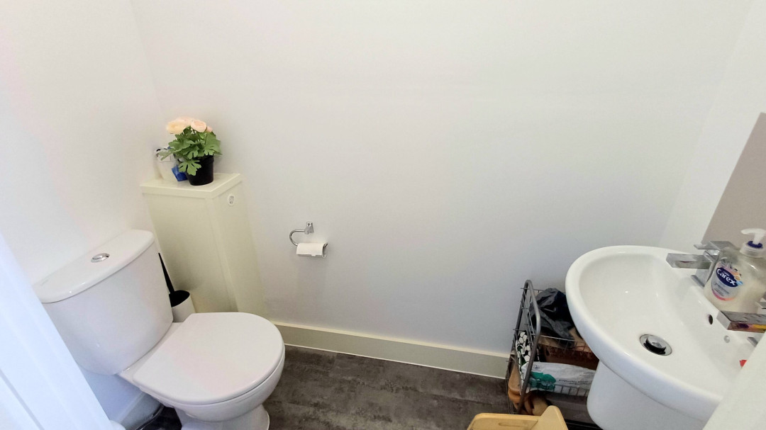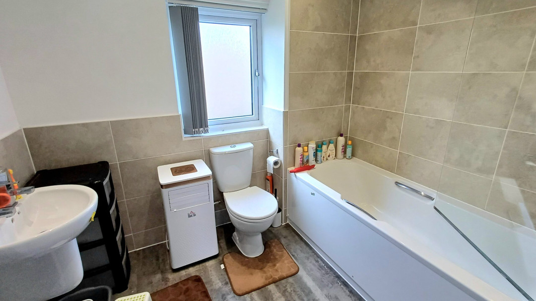 Fitted with a white three piece suite comprising, wash hand basin, panelled bath, low level WC. Radiator. Part tiled walls. Recessed spotlights to the ceiling. Frosted double glazed window to the rear elevation.