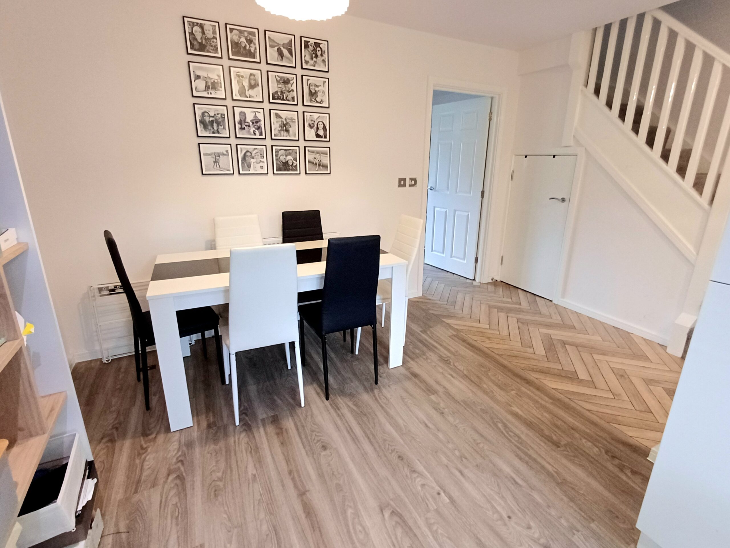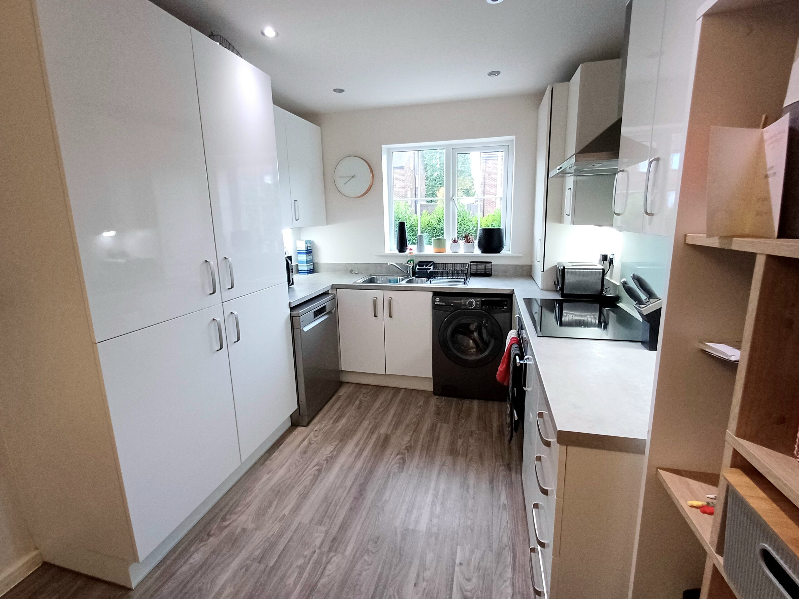 Range of base and eye level units incorporating a sink and drainer, electric induction hob with extractor over, oven, space for washing machine and dishwasher, built in fridge freezer, spot lighting, radiator, dining area, spot lighting, window to front.