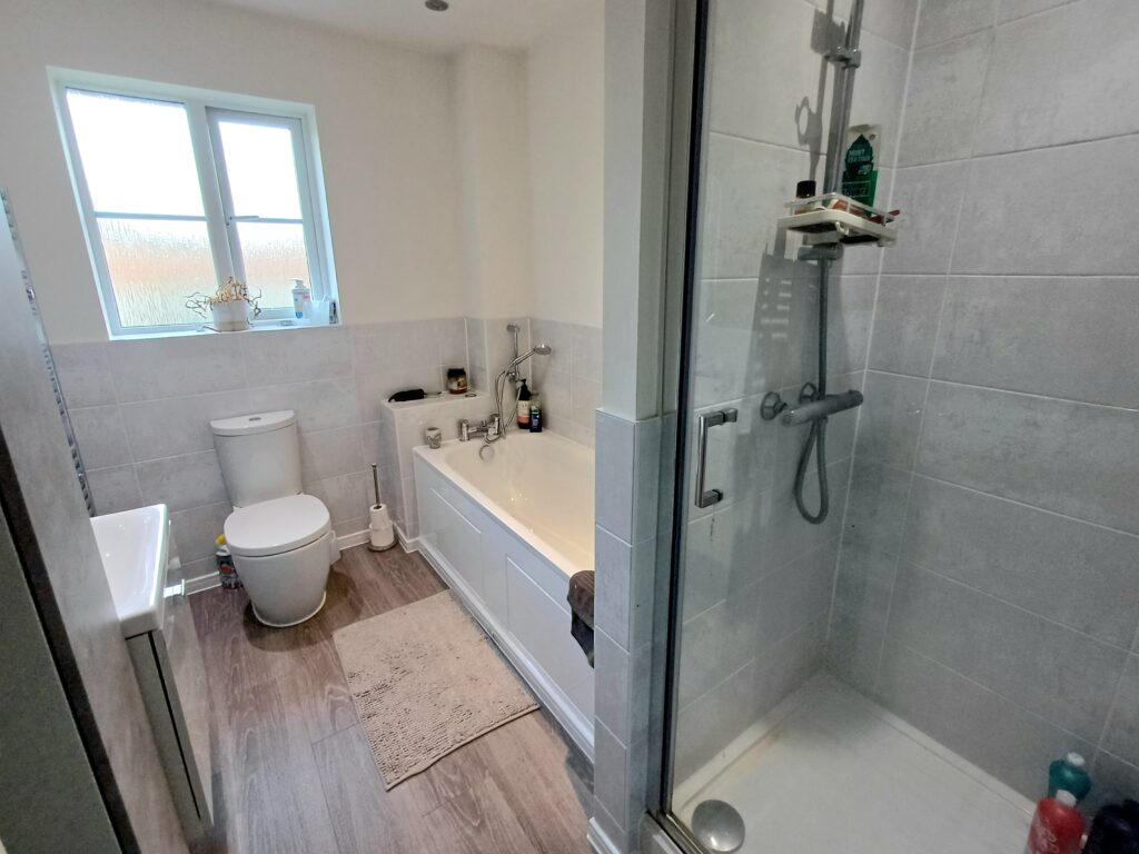 Low level WC, wash basin, panelled bath, separate shower cubicle, towel radiator, part tiled walls, window to rear.
