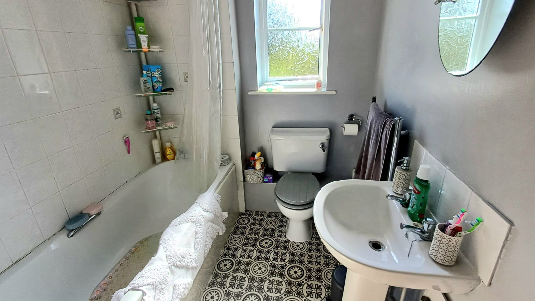 Window to rear, suite to comprising of a panelled bath complete with electric shower over, pedestal wash hand basin and low level WC, part tiled walls.