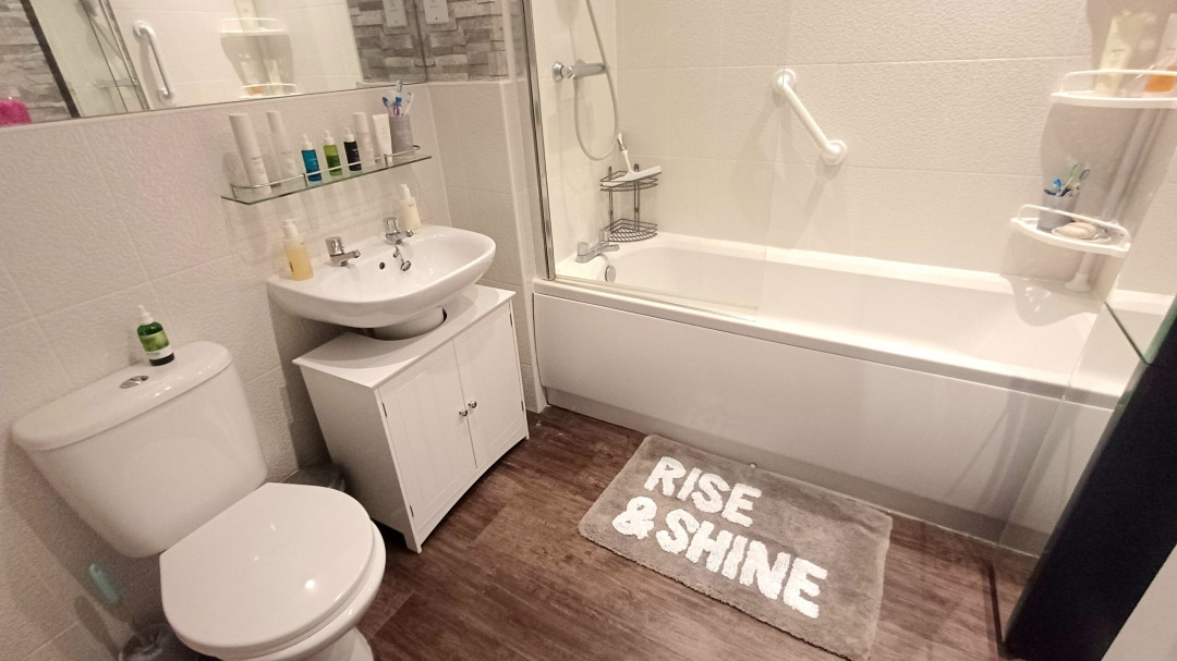 Suite comprising of a low level WC, wash basin, panelled bath with shower over, radiator.