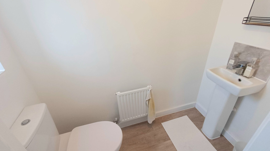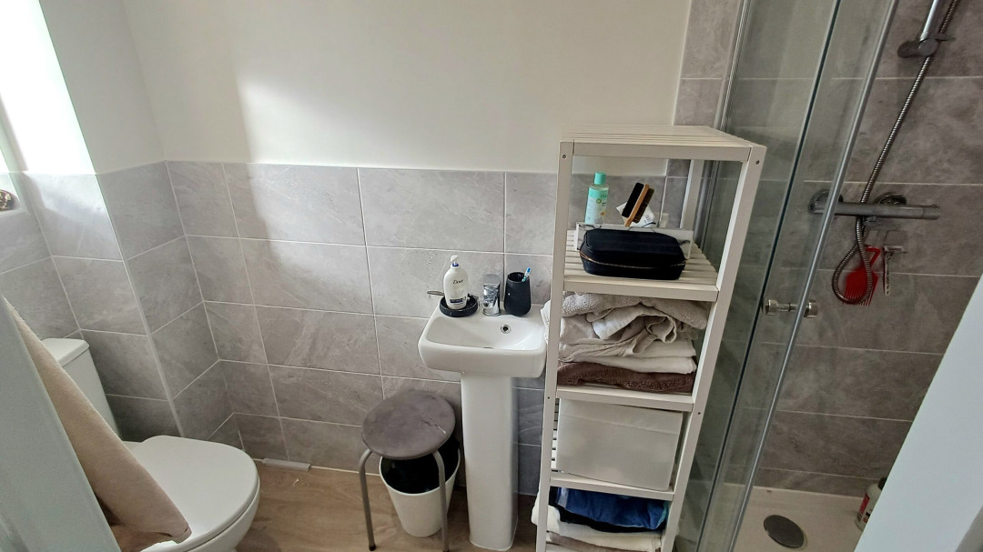 Low level WC, wash basin, shower cubicle, towel radiator, part tiled walls, window to side.