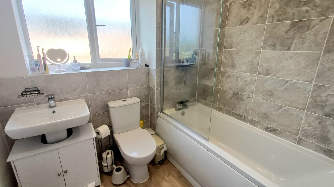Low level WC, wash basin, panelled bath with shower over, part tiled walls, towel radiator, spot lighting, window to front.