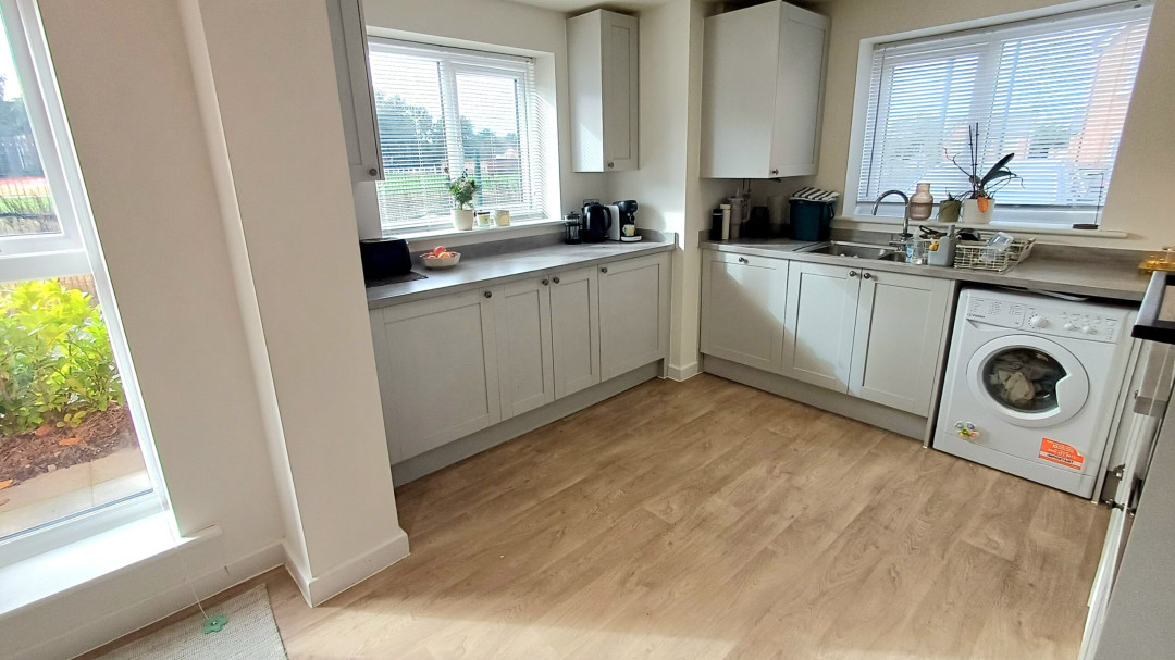 Base and eye level units incorporating a sink and drainer, gas hob with extractor over, double oven, built in fridge freezer and dishwasher, space for washing machine, radiator, spot lighting, wood effect flooring, space for dining table, windows to side and front.