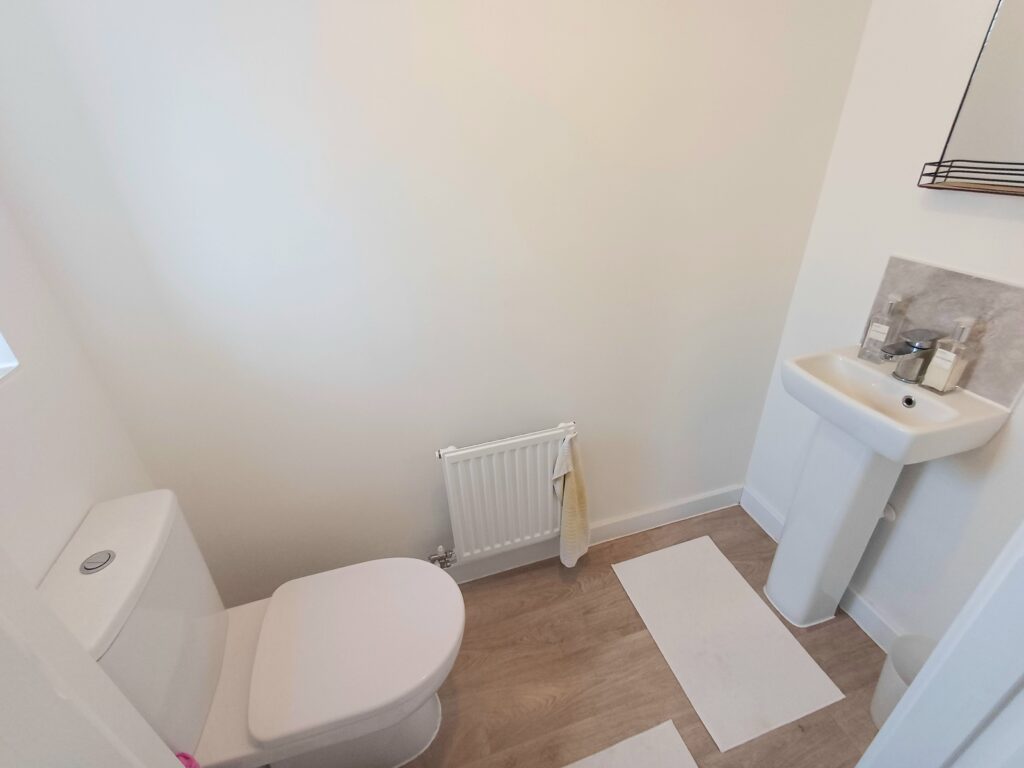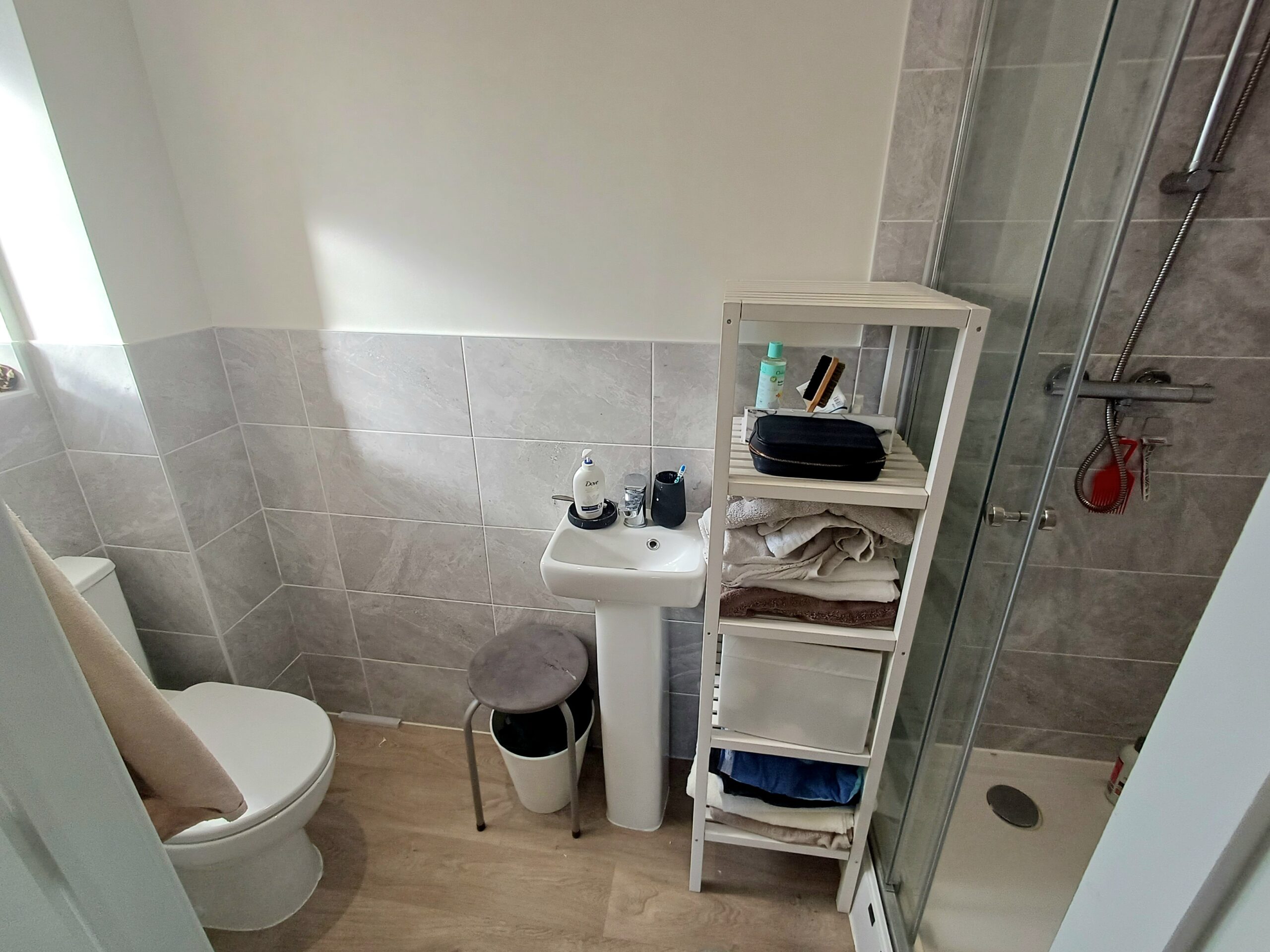 Low level WC, wash basin, shower cubicle, towel radiator, part tiled walls, window to side.