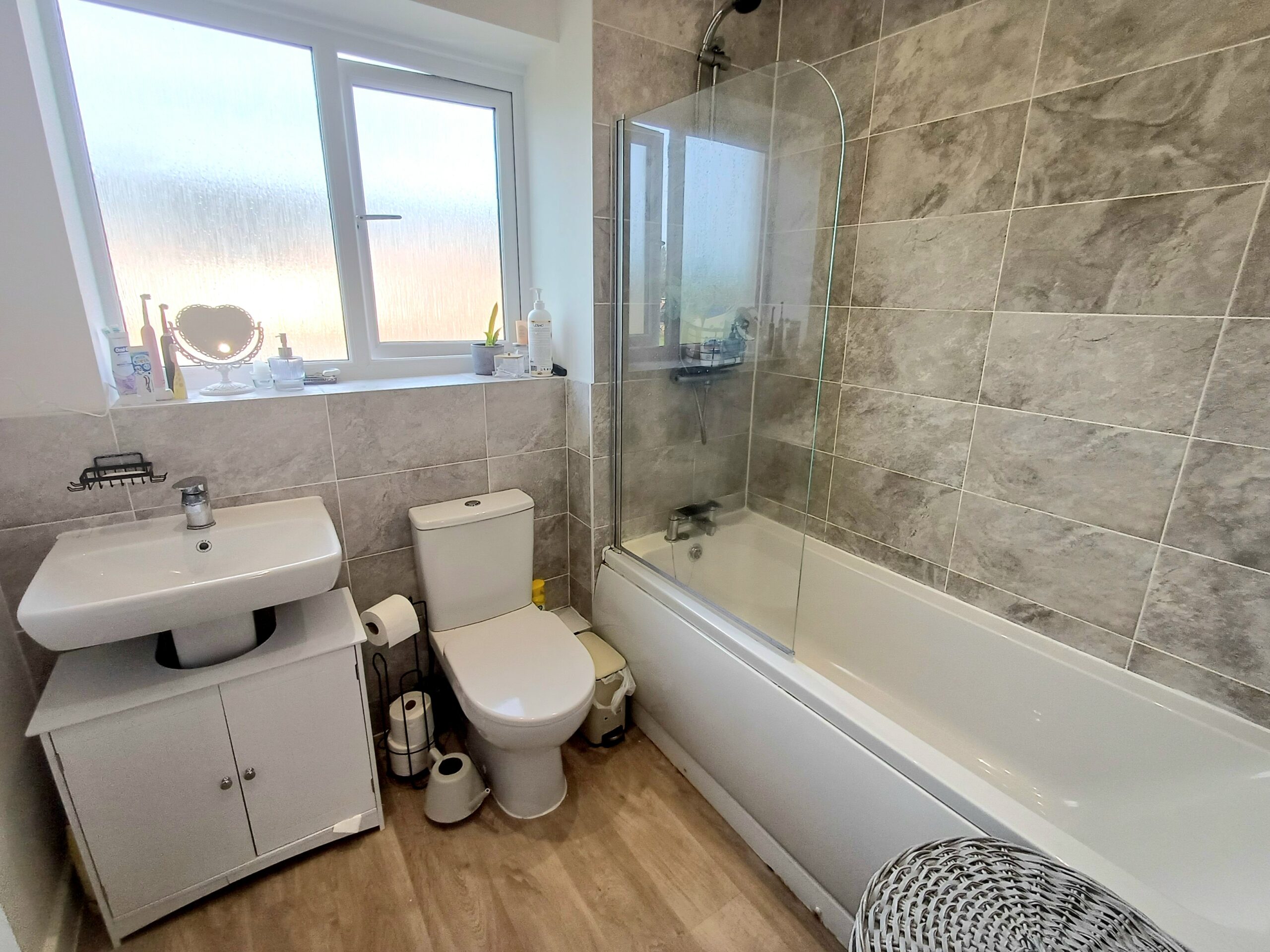 Low level WC, wash basin, panelled bath with shower over, part tiled walls, towel radiator, spot lighting, window to front.
