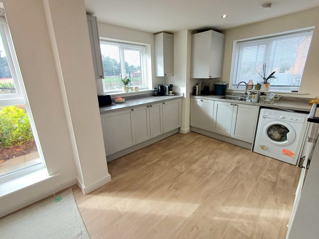 Base and eye level units incorporating a sink and drainer, gas hob with extractor over, double oven, built in fridge freezer and dishwasher, space for washing machine, radiator, spot lighting, wood effect flooring, space for dining table, windows to side and front.