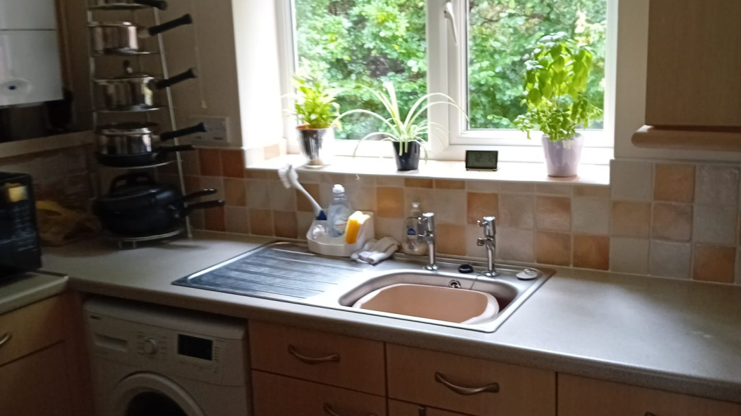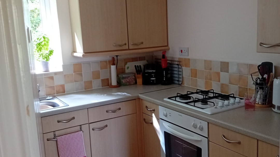 Fitted with wall cupboards, base units and drawers. Work surface housing stainless steel sink unit and drainer with mixer tap and tiled splashbacks. Fitted oven, four ring hob and space for washing machine and fridge/freezer. Window to the rear and radiator.