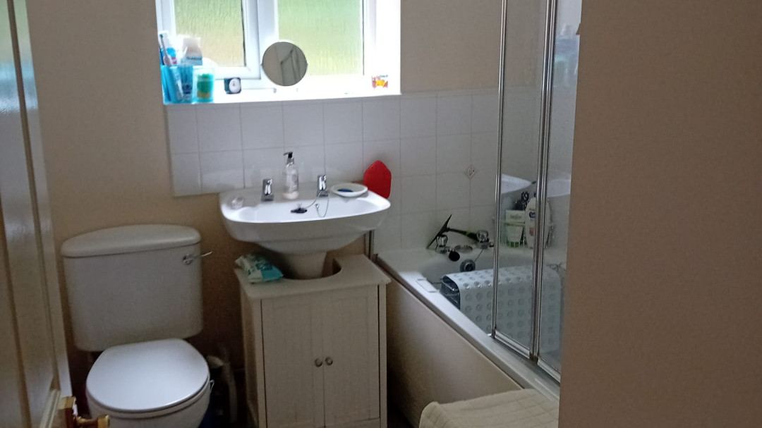 Fitted with white suite comprising WC, pedestal wash hand basin and bath with overhead shower. Part tiled walls, window to the rear and radiator.