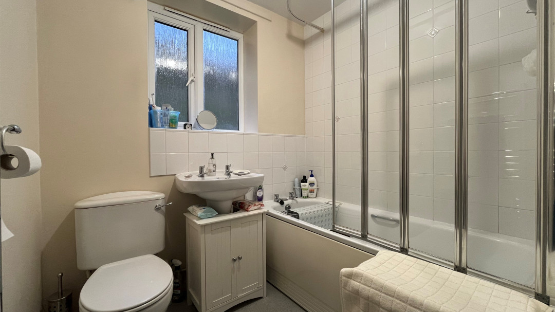 Fitted with white suite comprising WC, pedestal wash hand basin and bath with overhead shower. Part tiled walls, window to the rear and radiator.