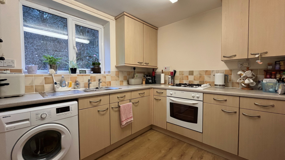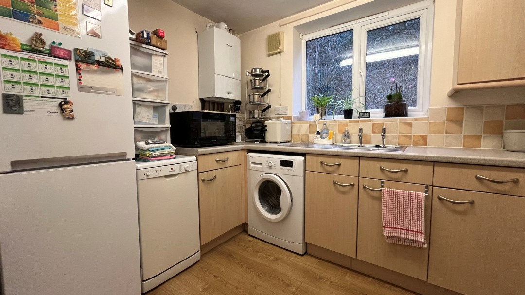 Fitted with wall cupboards, base units and drawers. Work surface housing stainless steel sink unit and drainer with mixer tap and tiled splashbacks. Fitted oven, four ring hob and space for washing machine and fridge/freezer. Window to the rear and radiator.