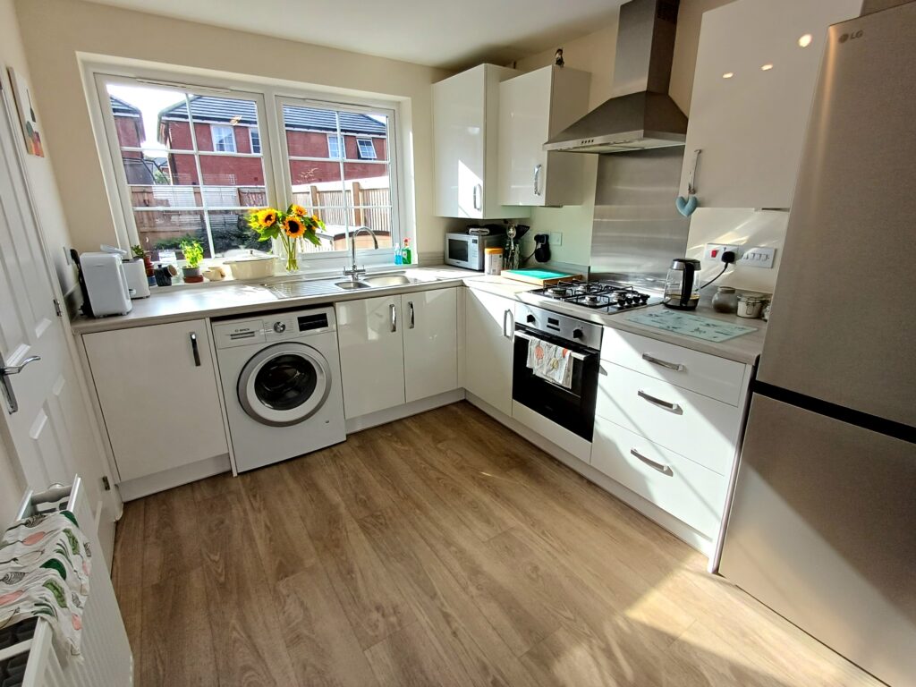 Modern range of wall and base units with sink and drainer, built-in electric oven, gas hob with extractor hood over, space for fridge freezer and washing machine, radiator, wood effect flooring, window to the rear.
