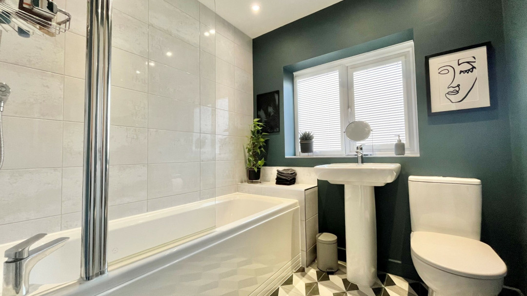 A three piece suite including a bath with shower over, toilet, sink, window to the rear, radiator.
