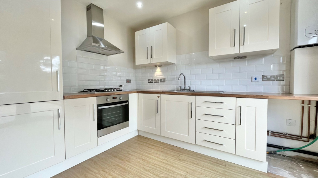 Fitted with a modern range of base and eye level units incorporating a sink and drainer, hob with extractor over, oven, built in fridge freezer, laminate flooring, French doors to garden.